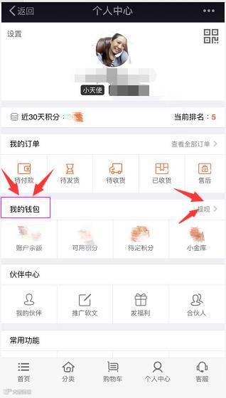 5、提现操作:打开个人中心——我的钱包如下图所示: