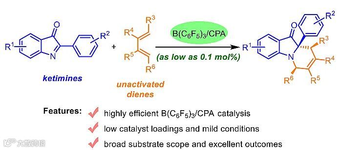 近日,南开大学化学学院李鑫教授团队借助于DFT计算,成功实现了B(C6F5)3/手性磷酸(CPA)催化的酮亚胺与非活化二烯的不对称氮杂Diels-Alder反应(图2),以高收率(up to 99%)与高立体选择性(up to >20:1 dr, 98:2 er)得到了含有季碳手性中心的四氢吡啶化合物。