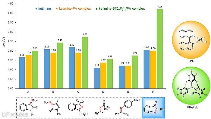 首先,作者对一系列常见的酮亚胺及酮亚胺—催化剂复合物进行了亲电指数(ω)的计算(图3),发现2-苯基-3H-吲哚-3-酮(F)在B(C6F5)3/磷酸(PA)的活化下亲电性增强最为显著,是最合适的底物。