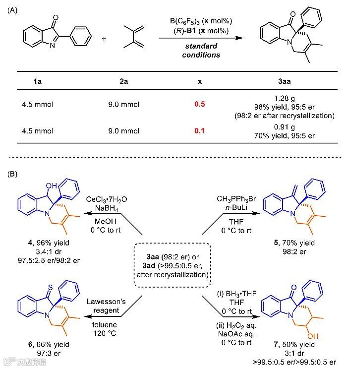 为了证明该反应的实用性,作者进行了克级反应与产物转化实验(图5),其中克级反应的催化剂用量可降至0.1 mol%,此时产物的对映选择性仍能得到保持。
