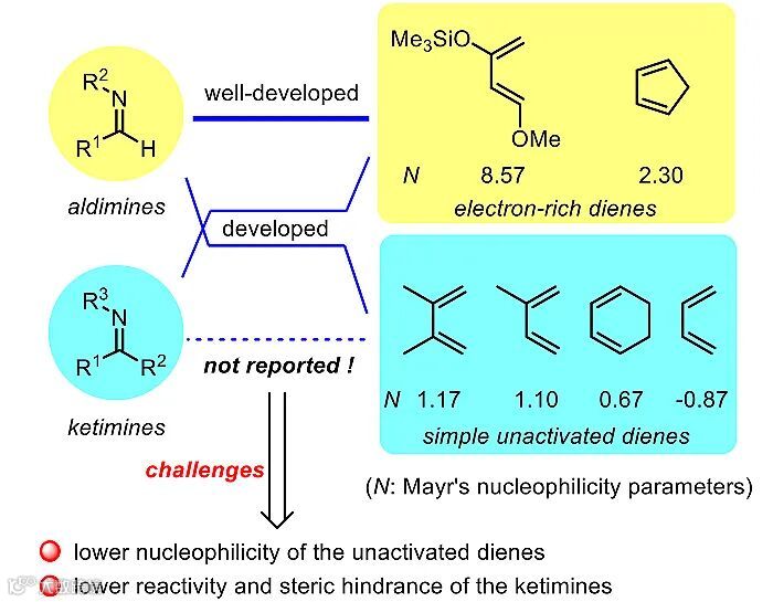 手性四氢吡啶结构广泛存在于天然产物和生物活性分子中,而不对称氮杂Diels-Alder反应则是构筑该类化合物最高效和原子经济性的方法之一。Danishefsky二烯、Brassard二烯和环戊二烯等高活性二烯,通常被用于氮杂Diels-Alder反应中。而对于简单的非活化二烯(例如异戊二烯)则很少被使用,可能是因为其亲核性较低,这可以通过Mayr课题组提出的亲核性参数(N)得到证实。以亚胺作为亲二烯体的氮杂Diels-Alder反应中,最常用的是醛亚胺。相比之下,酮亚胺的相关报道较少,且这些报道的反应局限于使用高活性二烯或存在催化剂用量大等问题。因此,发展非活化二烯与酮亚胺的不对称氮杂Diels-Alder反应非常具有挑战性(图1)。