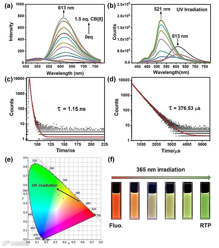 纯有机室温磷光由于其寿命长、斯托克斯位移大等特点,引起了研究者们的极大兴趣,并在生物成像、有机发光二极管和光学开关等方面被广泛应用。其中,水相室温磷光由于容易区分短寿命的背景荧光,从而在时间分辨生物成像领域具有潜在应用价值。然而,由于水溶液中高浓度溶解氧和分子快速运动可以引起发光淬灭,因此在水相中实现高效室温磷光发射仍然是一项富有挑战性的工作。另外,特异性细胞染色体系目前主要是通过将不同的细胞器靶向剂共价连接到发色团上来实现的,这通常需要繁琐的化学合成或反复纯化过程,因此开发新的细胞标记和定位方法具有重要的科学意义。