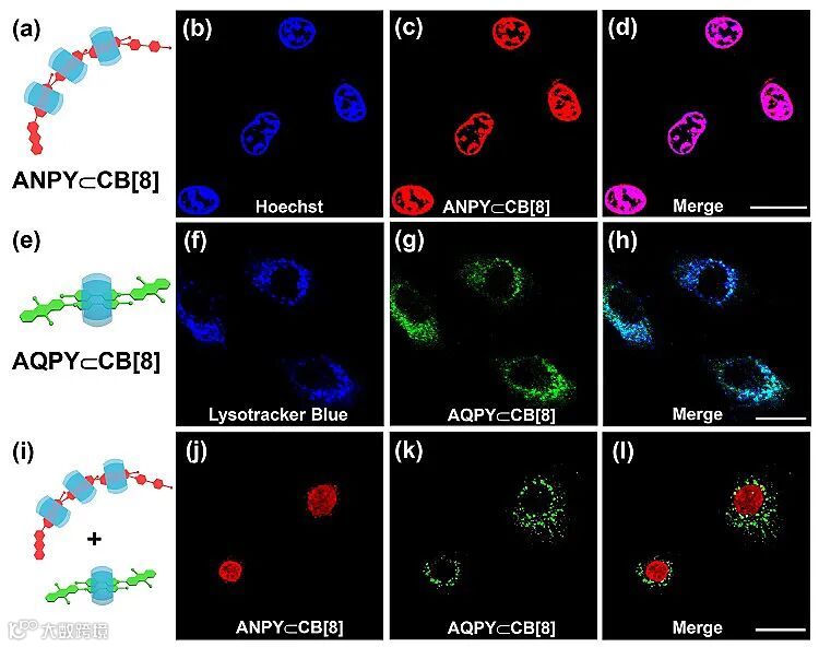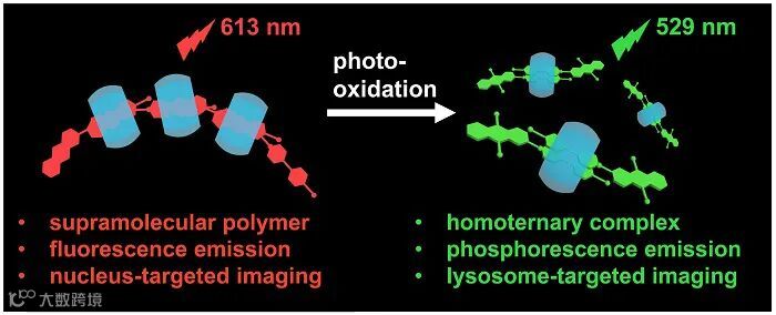 在前期工作基础上,该课题组巧妙地设计合成了一种能够通过光氧化驱动的超分子荧光磷光双向发光体系,成功地实现了活细胞中双细胞器的多色靶向成像。基于葫芦脲(甘脲和甲醛缩合的一类大环化合物)的分子识别和键合客体蒽的光氧化反应,他们发现通过葫芦[8]脲稳定的分子间电荷转移相互作用,大环化合物可以有效地诱导蒽基共轭溴苯基吡啶盐组装形成超分子聚合物,从而显著增强其红色的荧光发射。在紫外光照射下,蒽基被氧化成蒽醌,组装模式也由“头对尾”的超分子聚合物转化为“头对头”的三元包合物,而三元包合物能够在水溶液中发射出强烈的绿色磷光。