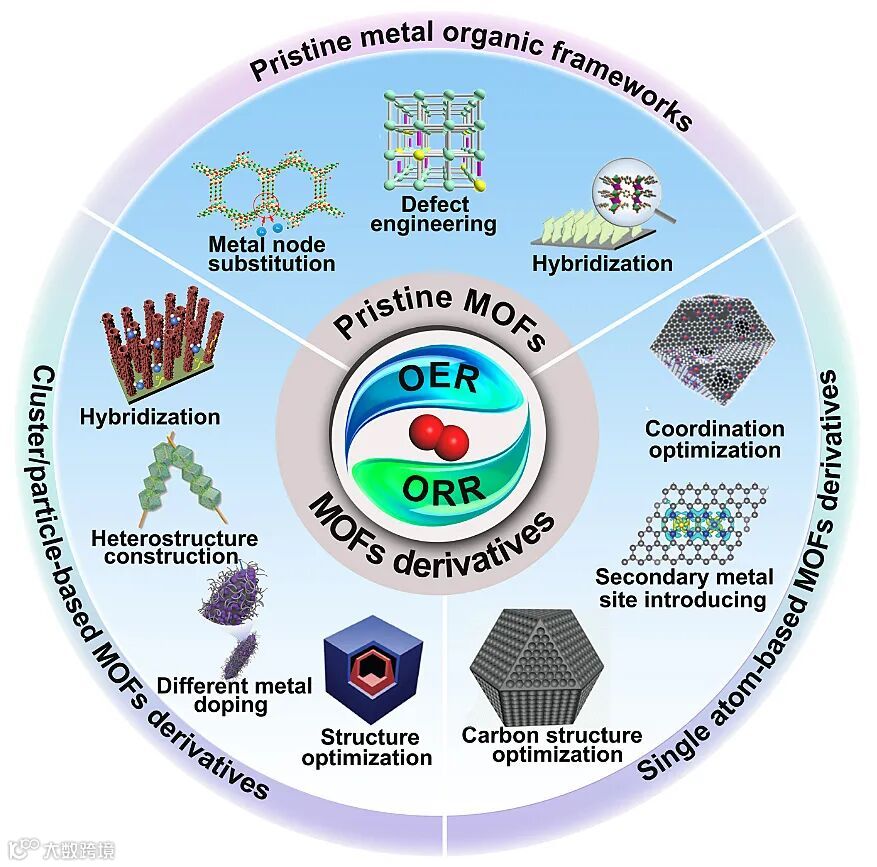 金属-有机框架化合物(Metal Organic Framework, MOF)是一类成分可调、孔径结构可控的新型多孔材料,在气体分离、药物载体、电化学催化等诸多领域都展现出非常高的潜力。因其原子级分散的金属中心和大的比表面积,MOF及其衍生物被广泛地用作电催化ORR和OER的催化剂材料,并展现出非常好的性能,近年来吸引了无数科学家的持续关注。在基于MOF材料的电催化氧反应催化剂的研究中,科学家们开发了许多针对于催化活性位点的调制策略,从而助力高效氧气电催化剂的构筑。将这些精巧的调控策略进行总结归纳,有助于为研究者构筑高效电催化剂提供一些思路和技巧,因此显得非常有必要。