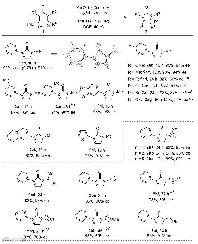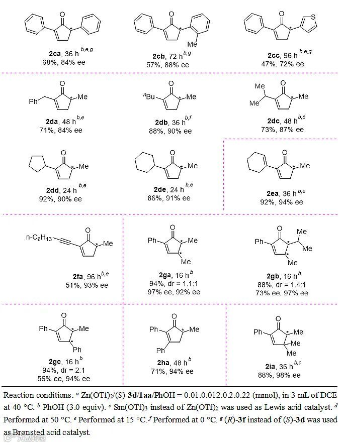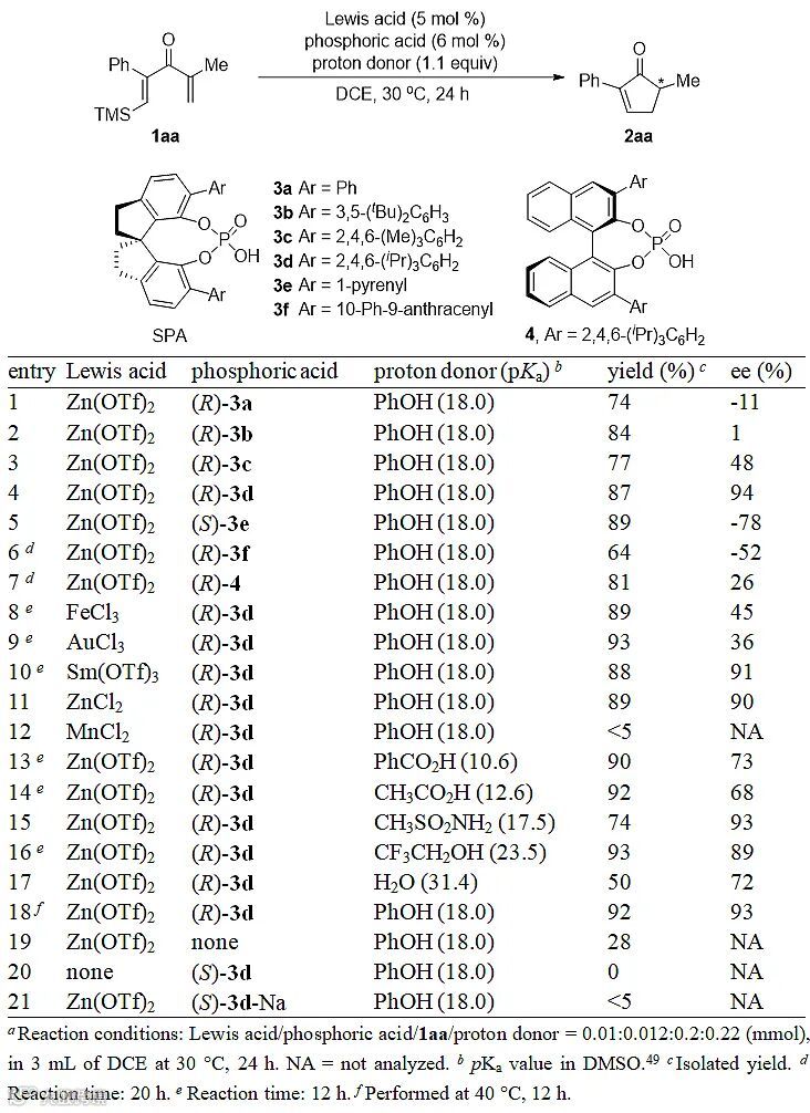 研究者选取1aa作为模型底物,首先对手性螺环磷酸3进行了评价(图2, entries 1-7)。当使用大位阻芳基取代的(R)-3d时,给出最高的对映选择性(94% ee,entry 4)。Lewis酸对反应的活性和对映选择性都有明显影响(entries 8-12),Lewis酸性较弱的MnCl2不能催化反应发生(entry 12)。质子源的pKa和反应的结果有明显的关联:酸性较弱的H2O使反应变慢,对映选择性也有所降低(entry 17);酸性较强的羧酸可以使反应明显加速(entries 13和 14);和苯酚酸性接近的三氟乙醇以及甲磺酰胺给出和苯酚类似的结果(entries 15 和 16)。进一步研究表明,当反应在40 ℃下进行时,速度明显加快,而对映选择性基本保持(entry 18)。Lewis酸可以单独催化反应发生,但收率大幅下降(entry 19)。当只使用手性磷酸作为催化剂(entry 20),或使用磷酸钠盐替代手性磷酸时(entry 21),反应不能发生。