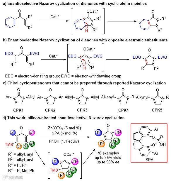 手性环戊烯酮是一类重要的合成中间体,并且作为核心骨架广泛存在于天然产物和药物分子中。Nazarov反应是构筑多取代、官能化的环戊烯酮结构的重要方法。近年来,催化不对称Nazarov环化反应也取得一系列重要进展。但是由于Nazarov环化反应经历了碳正离子中间体,若底物存在多个β氢位点,均有可能发生碳正离子的β-氢消除,则难以获得单一产物。在以往的报道中,人们在底物中引入环状烯烃结构或者芳环结构,利用环结构中碳正离子的稳定性或芳构化作用将产物的双键控制在多取代烯烃一侧(图1a);或者向底物两侧烯烃上分别引入推、拉电子基团,使碳正离子稳定在给电子基团一侧,进而确定产物的双键位置(图1b)。但是上述策略主要依赖底物设计,严重限制了所合成手性环戊烯酮产物的结构多样性(图1c)。