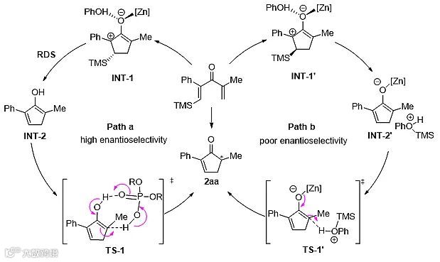 根据上述机理实验,研究者提出了可能的反应机理(图6)。底物首先被Zn(OTf)2和PhOH活化经历4π电环化生成中间体INT-1。此时TMS基团和配位的苯酚之间存在顺反两种构型(INT-1和INT-1’)。在INT-1中,配位的苯酚可能会发生分子内进攻脱除硅基生成自由烯醇INT-2,随后经历手性磷酸促进的不对称质子转移过程获得目标产物。在整个催化循环中,硅原子独特的电子效应使得碳正离子可以定位在硅基的β位,因此反应可以获得高区域选择性。烯醇中间体INT-2的不对称质子转移是反应的手性决定步。在这一步中,手性磷酸作为“手性质子梭”,通过氢键相互作用实现了反应的立体化学控制(Science, 2019, 366, 990; J. Am. Chem. Soc., 2020, 142, 10557; J. Am. Chem. Soc., 2015, 137, 8700; Angew. Chem. Int. Ed., 2011, 50, 11483; Angew. Chem. Int. Ed., 2014, 53, 3913)。动力学研究表明,硅基的消除可能是反应的决速步。手性磷酸虽然没有直接参与到决速步中,但是它可能通过降低质子转移过程的反应能垒来加速整体反应的进行。当硅基和配位的苯酚处于反式时(INT-1’),反应可能经历分子间脱硅生成烯醇锌和苯酚鎓离子(INT-2’),随后发生不受手性磷酸调控的直接的碳-质子化过程生成低对映选择性产物。因为硅基的大小和构型会影响反应中两种中间体的比例(INT-1和INT-1’),进而导致反应经历不同的历程(path a和path b),所以硅基对于反应的对映选择性会产生显著影响。