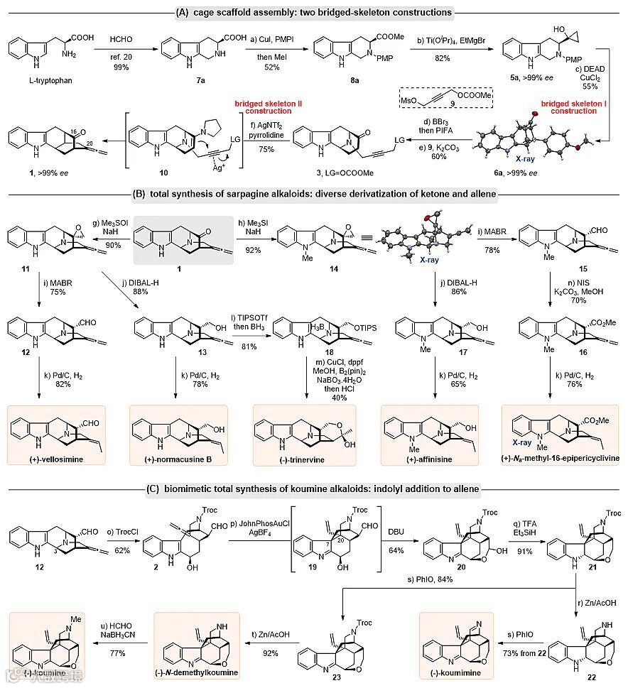 如图3所示,该研究以便宜的L-色氨酸为起始原料,经Pictet-Spengler和Kulinkovich环丙烷化等反应制备得到环丙醇底物,进而通过新发展的选择性胺氧化/环丙醇开环环合反应构建了吲哚并氮杂[3.3.1]壬烷桥环骨架。随后,通过有机/金属协同活化的酮羰基α-联烯化新反应,构建了氮杂[2.2.2]辛烷桥环骨架并同时引入了易于修饰的联烯结构单元,实现了sarpagine型生物碱五环核心骨架的高效构建。以此核心骨架化合物1为关键中间体,通过对C16位羰基和C20位联烯的官能团转化,完成了5个sarpagine型生物碱(affinisine、normacusine B、trinervine、vellosimine和Na-methyl-16-epipericyclivine)的集群式不对称全合成。此外,借鉴生源合成策略,断裂sarpagine型生物碱骨架中的C3−N4键,并通过Au催化的吲哚对联烯的去芳香化加成,实现了koumine型生物碱骨架的快速构建,最后经官能团转化完成了3个koumine型吲哚生物碱(koumine、koumimine和N-demethylkoumine)的不对称全合成。