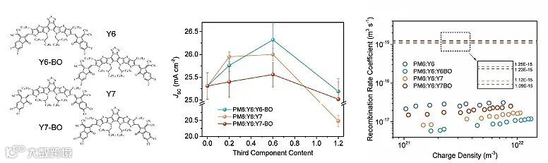 图1. 使用的非富勒烯受体材料、器件性能以及复合测试