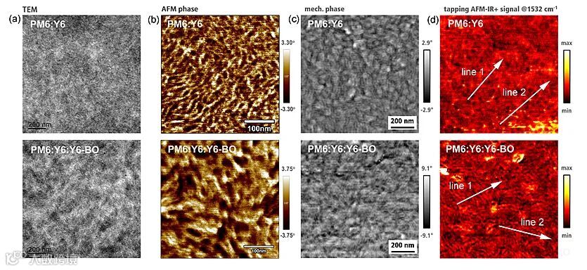 图2. 共混薄膜的透射电子显微镜(TEM)、原子力显微镜(AFM)、光诱导力显微镜(PiFM)