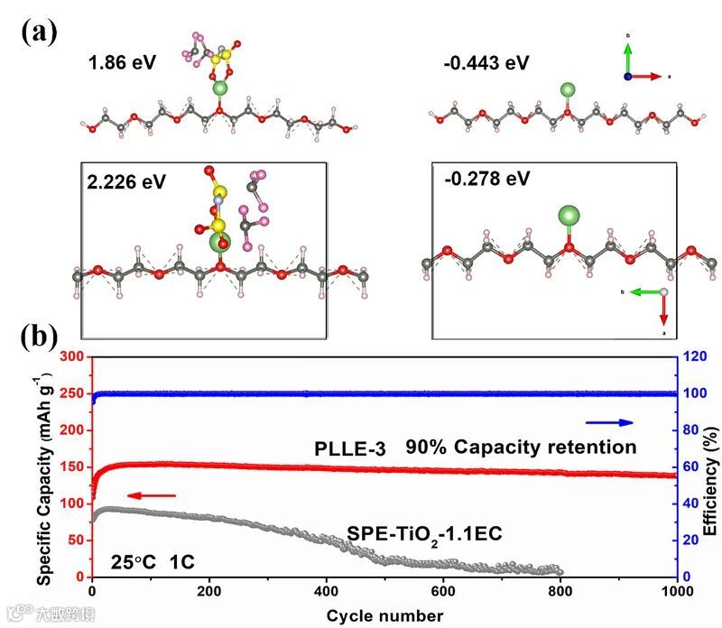 图2.(a)醚氧低聚物对LITFSI的解离能和对Li离子的吸附能(b)复合电解质的循环性能