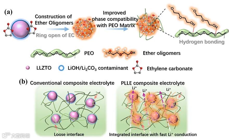 图1.(a)LiOH/Li2CO3污染物与碳酸乙烯酯的分子间相互作用(b)及其离子传输示意图