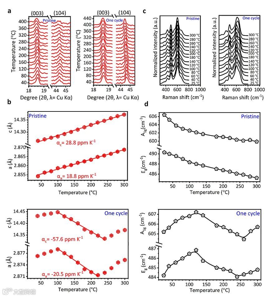 结合先前的研究,利用材料的热膨胀系数来评估无序结构的转变情况。与未循环的原始样品相比,循环后的样品由于无序结构的存在使得晶胞参数在一定温度范围内收缩,其热膨胀系数与材料内部无序结构的浓度有关,晶胞参数a和c在温度范围为100-250度下热膨胀系数为-57.6,-20.5 ppm K-1。结合加热的原位拉曼光谱研究,进一步揭示了无序结构的在局域结构尺度上的特性。