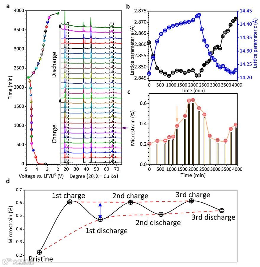 图3. 无序结构的生成以及对后续循环的影响。(a) 不同充放电时间的非原位XRD图谱。(b) 对应的晶胞参数演变。(c) 对应的微应力演变。(d) 前三圈的微应力演变。