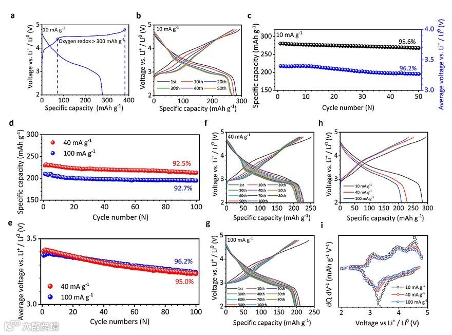 对材料进行电化学表征,在首圈充电激活过程中,4.5 V电压平台部分贡献的容量大于300 mAh g-1,约占整体充电容量的80.5%,表明有大量的晶格氧被激活。在随后的放电,材料的放电比容量能达到280 mAh g-1。结合X射线光电子能谱表征(XPS),可以确定晶格氧的可逆氧化还原贡献了大部分的容量。在首圈大量晶格氧被激活后,对材料在不同倍率下进行电化学循环测试,显示出优异的克容量和平均电压保持率。以上结果表明,大量晶格氧的激活使材料能够获得超高的克容量,并且显示出优异的循环性能。