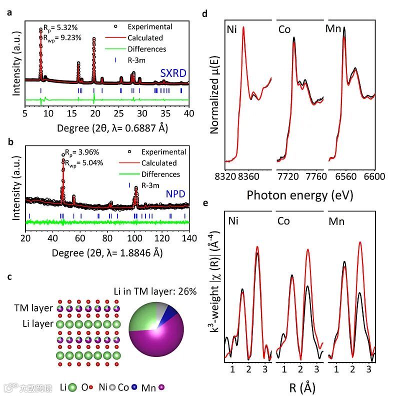 图1. 所制备富锂层状氧化物材料的原始结构表征。(a, b) X射线衍射和中子衍射联合精修图谱。(c) 基于衍射图谱精修结果的理想结构模型。(d, e) Ni, Co, Mn元素K边X射线近边吸收谱和加权傅里叶变换的扩展边吸收谱。