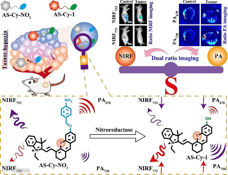 基于这种优化的含硫半花菁骨架,作者首次设计合成了近红外荧光/光声双比率型硝基还原酶探针,这使得肿瘤缺氧在体内不同深度的精准定量可视化成为可能。探针由一个新的近红外荧光/光声硫杂半花菁和4-硝基苯组成,当被与肿瘤缺氧相关的生物标志物激活时,表现出10倍的近红外荧光信号增强 (I773/I733) 和2.4倍的光声信号增强 (PA730/PA670)。