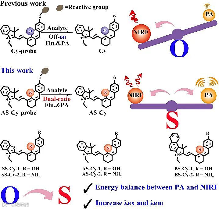 鉴于此,广西师范大学沈星灿教授和陈华副教授提出能量平衡策略,在经典含氧半花菁染料分子结构中,通过硫取代原子的氧原子的简单设计,巧妙地调控了荧光辐射跃迁和光声非辐射跃迁之间的能量平衡,构建双比率型近红外荧光/光声分子探针。由于硫原子取代氧原子,使得该半花菁类探针,展现出双比率型近红外荧光/光声性能;与经典的含氧半花菁染料相比,其吸收与发射波长明显红移,且荧光量子产率明显下降和光声性能明显上升,这一升一降显示探针分子中,荧光的辐射跃迁与光声的非辐射跃迁之间达到能量平衡。