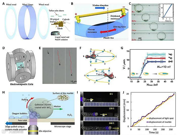图4. 三种基于共熔金属的机器人,它们分别代表了电、磁和光驱动。