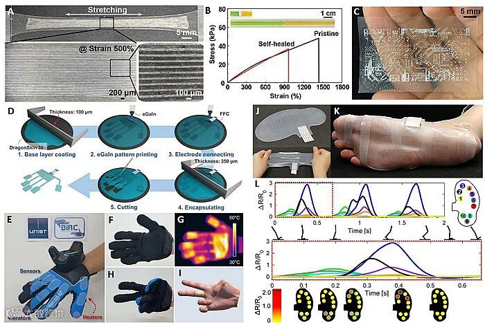 图2. 共熔镓-铟-锡合金在可穿戴设备和柔性电子器件的应用。