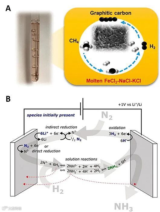 图6. 两个基于熔盐的化学反应(A,甲烷热解制氢;B,氮气转氨)。其中,后者避免了通常水体系下的产氢副反应,为高效率氮气还原提供了新思路。