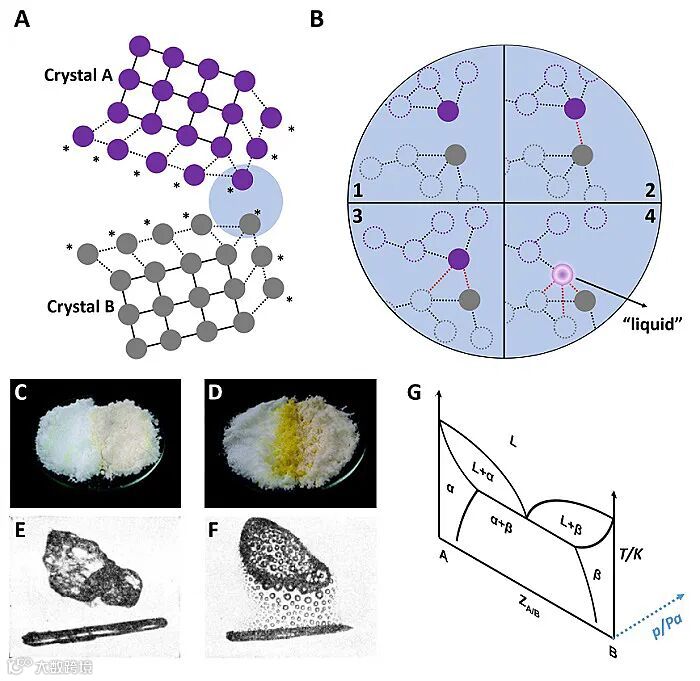 此综述主要分为三个部分。作者从共熔物的形成入手,介绍了导致熔点降低的原理(熵效应、化学势、相互作用、振动扩散机理和气-液-固-固四相机理)。其中,使用熵效应的解释易于理解,但过于理想化。基于化学势的解释引入了非理想成分,弥补了前者的不足,而非理想成分来源于组分间的相互作用。振动扩散机理是作者从纯净晶体的熔化过程推演得到的全新解释,即一定温度下,粒子振动足以挣脱晶格能的束缚导致了液体粒子的产生。气-液-固-固四相机理说明,共熔过程不能忽视气相的影响。