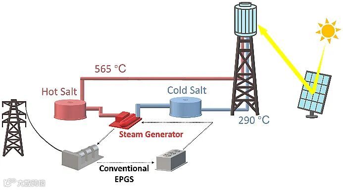 图5. 熔盐储能示意图。利用反光镜将太阳能集中,产生的热量可熔化共熔盐,通过热交换蒸汽发电机产生电能。