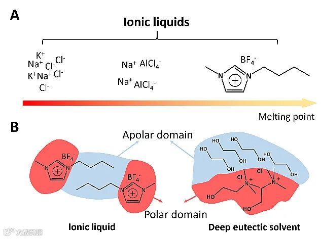 在下一部分中,作者总结了共熔金属、共熔盐和低共熔溶剂的性质和应用。共熔金属由于其良好的导电性和导热性,在材料制备和可穿戴器件等领域取得了令人瞩目的进展;共熔盐具有很高的相变潜热,在储能方面很有价值;低共熔溶剂绿色环保且可设计性强,在提取、分离以及材料制备领域有巨大潜力。值得一提的是,共熔物的应用并不局限于此。特别是低共熔溶剂作为一类新兴体系,其应用不如前两者成熟,这恰恰也促进了科研工作者们对它们应用的探索。