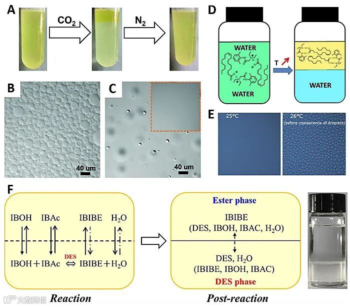 图8. 基于二氧化碳(A-C)和温度(D和E)响应的“智能”低共熔溶剂。通过设计低共熔溶剂体系,调控物质在其中的溶解度,可实现反应产物的自分离。