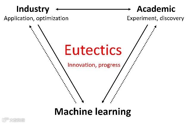 图10. 机器学习在共熔发展中的作用。双箭头代表产业界和学术界之间存在成熟的互动。实线箭头代表机器学习需要来自实际应用和科学实验的数据,而虚线箭头代表来自机器学习的反馈。