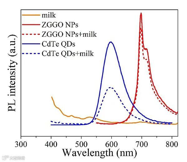 为了评估双信号免疫测定的稳定性和准确度,考虑了阴性牛奶中加标的SEC样品的分析。在254 nm紫外线下,牛奶基质在400-550 nm处显示荧光峰。由于具有持续发光性能的长余辉纳米粒子具有避免背景干扰的能力,在牛奶基质中仍显示696 nm处荧光信号,以用于检测应用。但是,其他荧光材料(例如CdTe QDs)在600 nm处显示出被牛奶基质显著淬灭的荧光信号。基于长余辉-金锥纳米复合材料具有抗干扰荧光信号和稳定拉曼强度可用于牛奶基质中的SEC检测。因此,开发基于长余辉和等离子金属材料纳米复合材料双模式光学免疫测定法具有良好准确性,在实际样品检测中显示出重要的潜在应用。