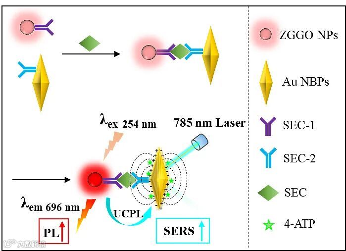 图1. 基于长余辉纳米粒子和等离子金锥纳米粒子复合材料的荧光和拉曼双光学信号的肠毒素检测免疫传感器