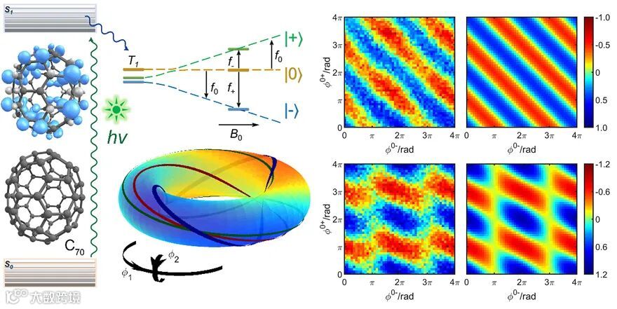 图1. C70分子的激发三线态在外部磁场中,由零场分裂和塞曼分裂(Zeeman splitting)产生三个磁能级,并通过两个位于X-波段的跃迁相互联系。研究人员三能级叠加态的制备并展示了其相位干涉现象。