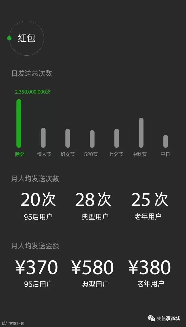 典型用户每月人均发送价值580块的红包给亲朋好友们,老年用户和95后用户 每月人均发送价值380元、370员给亲朋好友们。