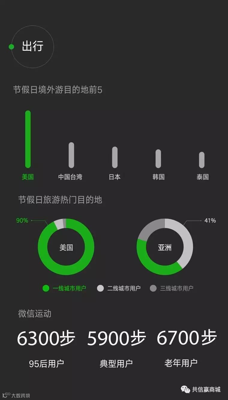 根据数据显示,节假日境外游目的地前五为:美国、中国台湾、日本、韩国和泰国。其中,一线城市用户格外青睐美国。占比高达90%。而在亚洲范围内的境外游,一二线城市占比相当,二线城市占比达41%。而微信运动方面,老年用户更为活跃,以6700步领先典型用户的5900步和95后用户的6300步。