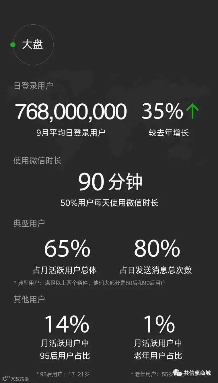 从整体来看,仅9月份,微信的日登录用户达到7.68亿,较去年同期增长35%。其中,50%用户每天使用微信的时长达到90分钟。典型用户指占月活跃用户总体65%、占日发送消息总次数80%的用户,同时满足这两个条件的大部分都是80后和90后用户。而95用户占月活跃用户总体的17%,老年人仅占1%。