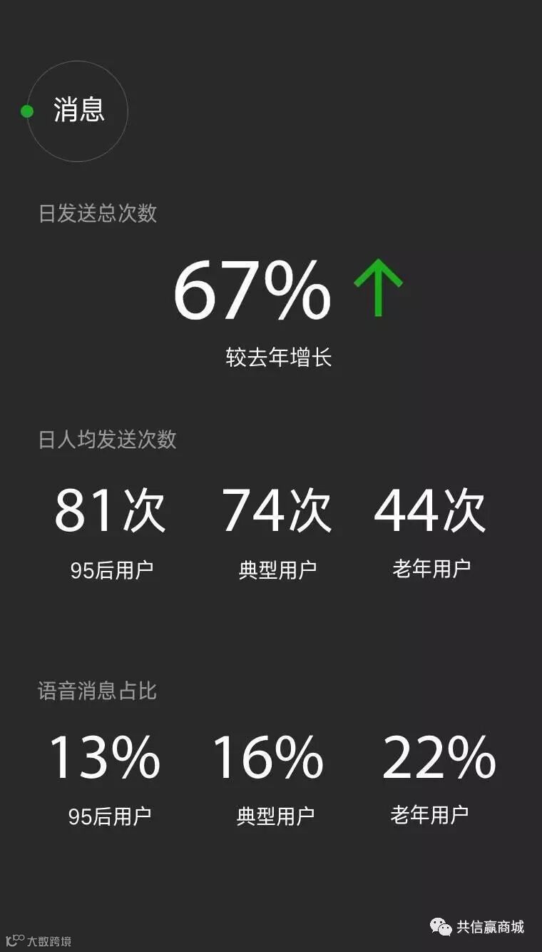 95后每天要发出81条信息,典型用户(即80后、90后)每天发送74条信息,老年人每天发送44条信息。但相比之下,老年用户发送的语音信息占比最高。占比达22%。而典型用户以及95后用户分别占比为16%、13%。但就总体而言,日发送总次数较去年同期增长67%