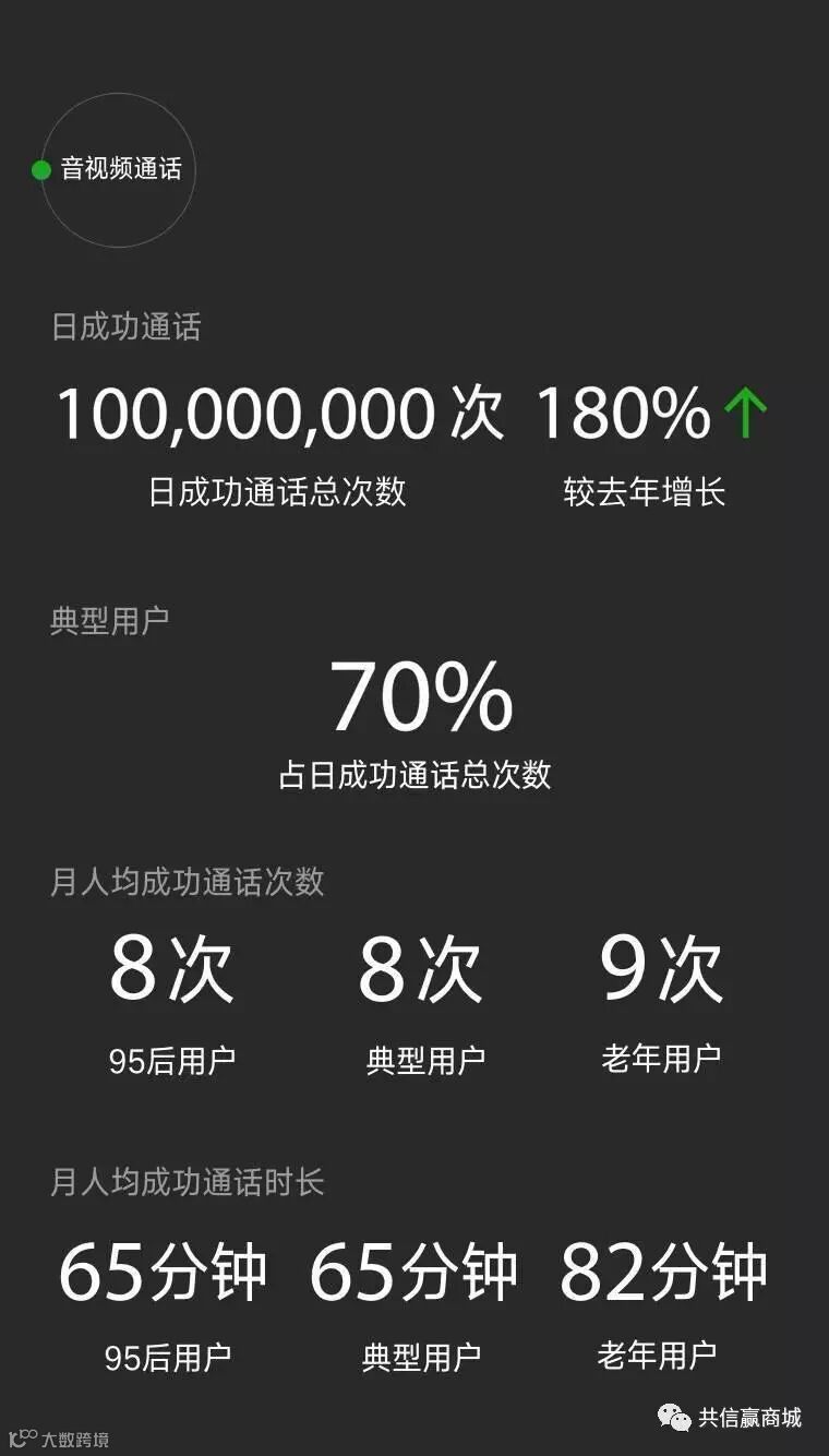 音视频通话日成功通话总次数达1亿次,较去年增长180%。虽然典型用户音视频通话中更会活跃,占比高达70%,但通话时长则是老年用户博得头筹,每月人均时长高达82分钟。95后用户以及典型用户通话月均时长均在65分钟。