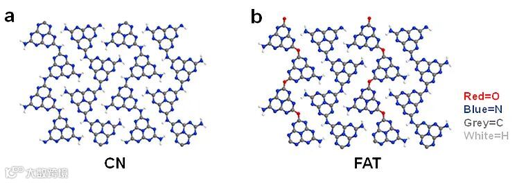 FAT是一种特殊的氧掺杂氮化碳,通过将CN中连接体/端基的N原子选择性替换成O原子制备而成,具有可调的较窄带隙(图1,及Adv. Energy Mater., 2018, 8, 1801084)。