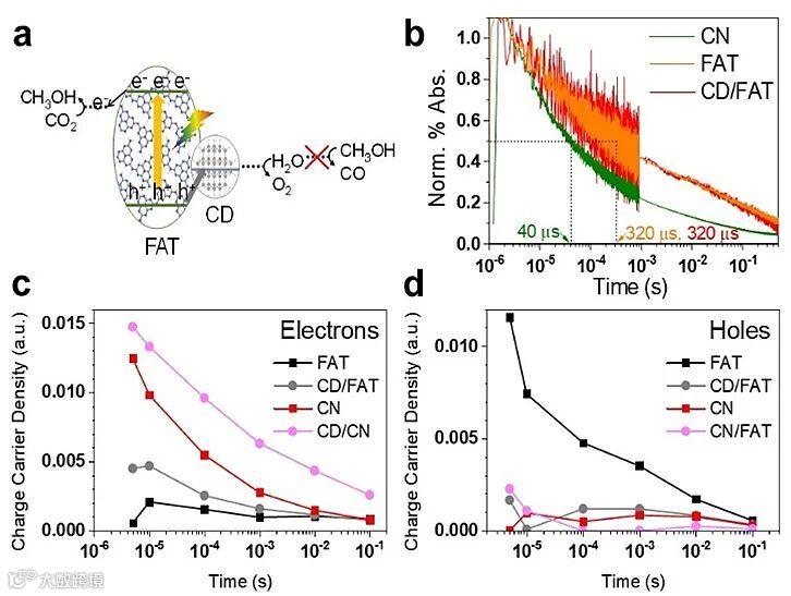 图3. (a)CD/FAT异质结示意图。(b)CN、FAT 和 CD/FAT 的μs-TAS 电子衰减动力学FAT、CD/FAT、CN 和 CD/CN 样品的 (c) 电子和 (d) 空穴的电荷载流子浓度。