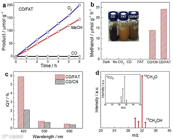 图2. (a) CD/FAT 在可见光 (λ> 420 nm) 下测量的光催化活性。(b) CD、FAT、CD/CN 等的对照实验。插图:CD、FAT 和 CD/FAT 的照片。(c) 在一大气压下模拟太阳光照射条件下测量的 CD/FAT 和 CD/CN 的 IQY。(d) CD/FAT 13CO2 光转化产物 13CH3OH 的质谱图。
