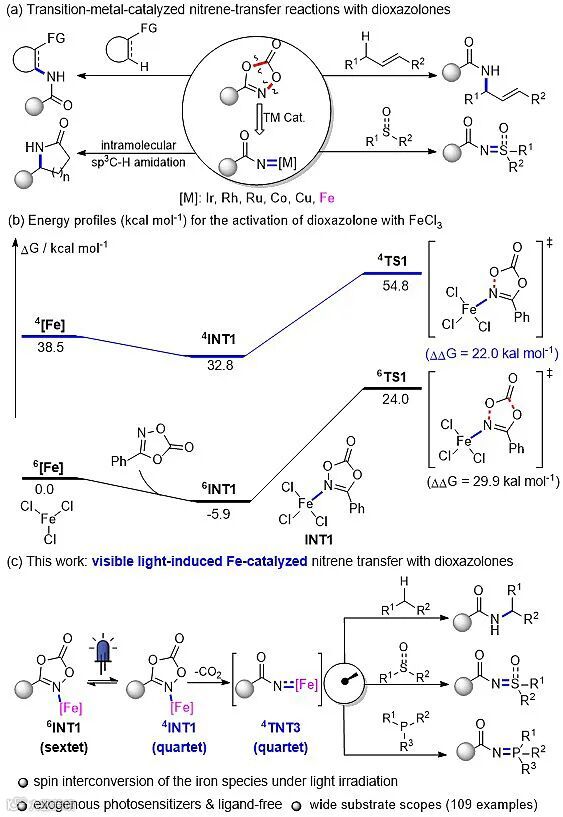 过渡金属催化的二噁唑酮类化合物的乃春转移反应虽然已经取得了一定的进展,但是通常局限于贵金属铱、铑、钌等。近日,大连理工大学于晓强教授和包明教授发展了一种基于二噁唑酮分子的可见光诱导铁催化的乃春转移反应,成功实现了分子间C(sp3)-N、N=S及N=P键的构筑。该反应无需加入额外的光敏剂或者配体,反应条件温和且具有良好的底物适用性。结合理论计算及机理探究实验,作者认为该反应可以在温和条件下实现的关键在于:可见光调控的铁-二噁唑酮物种自旋态的改变(六线态到四线态的转变)大大降低了二噁唑酮分子脱除二氧化碳时所需的活化能(∆G = 22.0 kal mol-1)。