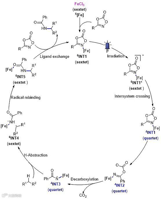 最后,以分子间的C(sp3)-N键的构筑为例,作者给出了可能的反应机理:首先,基态的铁催化剂(六线态)与二噁唑酮分子配位,生成中间体6INT1,在可见光的照射下,该物种被激发并通过系间窜跃过程生成四线态的4INT1,随后通过N-O键及C-O键断裂脱除CO2得到酰基乃春铁中间体4INT3。最后,4INT3经由连续的分子间氢原子转移(HAT)、自由基重组、配体交换过程得到目标产物并再生催化剂,开启下一催化循环。