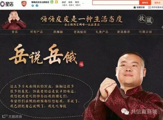 9月初,岳云鹏的“嗨嗨皮皮岳云鹏星店”正式上线,售卖两种河南特色食品——耗辣椒和老汤烩面。所有产品的包装上都印上了岳云鹏带着黄色头巾、穿着蓝布衫的卡通人物形象。这是小岳岳在粉丝中人气最高的、最经典、最具识别度的形象之一。