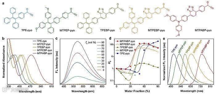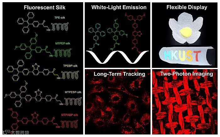 近期,香港科技大学唐本忠院士团队研发出一类活化炔基团修饰的具有聚集诱导发光(aggregation-induced Emission, AIE)性质的荧光染料,这类荧光染料在溶液中由于分子的自由运动不发出荧光,而聚集时分子的运动受限发出强烈的荧光。荧光染料上修饰的活化炔基团可以在无需任何催化剂,室温条件下快速和蚕丝蛋白上的伯胺基团进行生物共轭反应,非常方便的制备得到具有蓝、绿、黄、橙、红色的荧光蚕丝材料,并且蚕丝材料上化学结合的荧光染料与传统物理吸附法相比具有更强的保留能力。