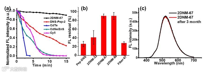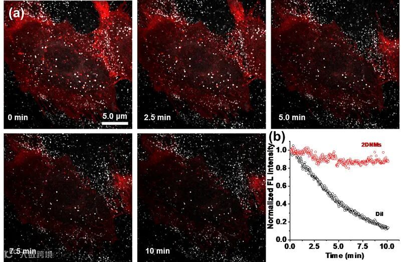 这类二维类肽纳米材料具有良好的荧光稳定性和抗光漂白能力。材料通过晶体结构限制荧光分子旋转和分子间间距控制,降低了活性氧分子的扩散,从而有效抑制光漂白现象(图3)。对固定细胞内吞囊泡进行了长达10分钟的持续荧光成像,结果表明这类二维类肽纳米材料在10分钟内无明显荧光衰减,而对照染料则在短时间内完全漂白;相比于目前常用的和已报道的几种新型染料和荧光颗粒,这类二维类肽纳米材料也显示了其更好的抗漂白性能(图4)。