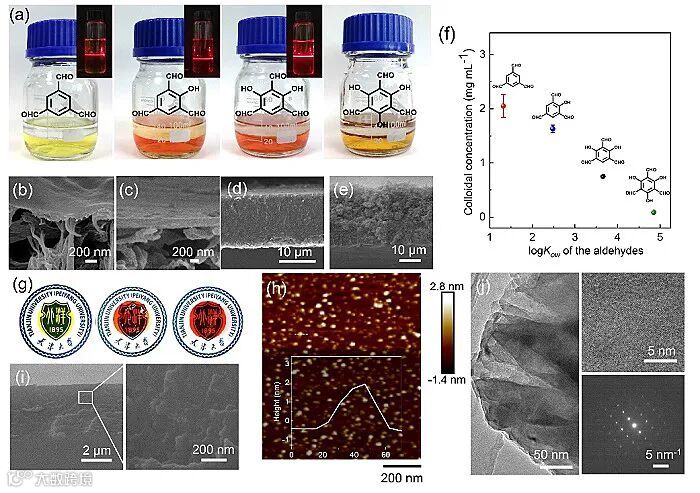 图2. (a) 基于有机相-水相反应体系COF-QAs胶体溶液和界面膜的形成,插图显示了相应胶体溶液的丁达尔效应;(b) COF-QA-TFB(I)、(c) COF-QA-SOH(I)、(d) COF-QA-DOH(I)和(e) COF-QA-Tp (I)的断面SEM图;(f) COF-QAs胶体溶液浓度与相应单体的正辛醇/水分配系数关系图;(g) COF-QA-TFB(P)、COF-QA-SOH(P)和COF-QA-DOH(P)膜照片;(h) COF-QA-SOH纳米盘的AFM图像;(i) COF-QA-SOH(P)膜断面SEM图;(j) COF-QA-SOH纳米盘的TEM图像。