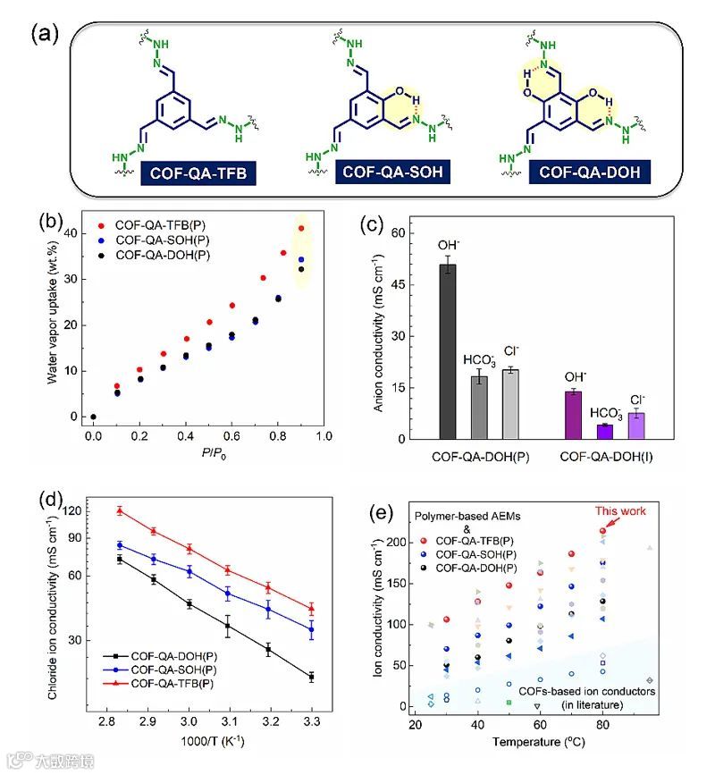图5. (a) COF-QAs框架内分子内氢键形成示意图;(b) 30 °C下COF-QAs(P)膜的水蒸气吸附曲线图;(c) COF-QA-DOH(P)膜和COF-QA-DOH(I)膜的阴离子传导性能对比;(d) COF-QAs(P)膜的氯离子传导率随温度变化曲线图;(e) COF-QAs(P)膜的离子传导性能与其他文献报道的离子传导膜对比图。