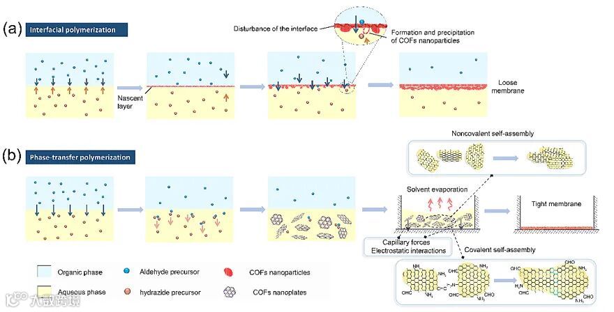 图4. (a) 界面聚合和(b) 相转移聚合制备得到COF-QAs膜的形成机制示意图。