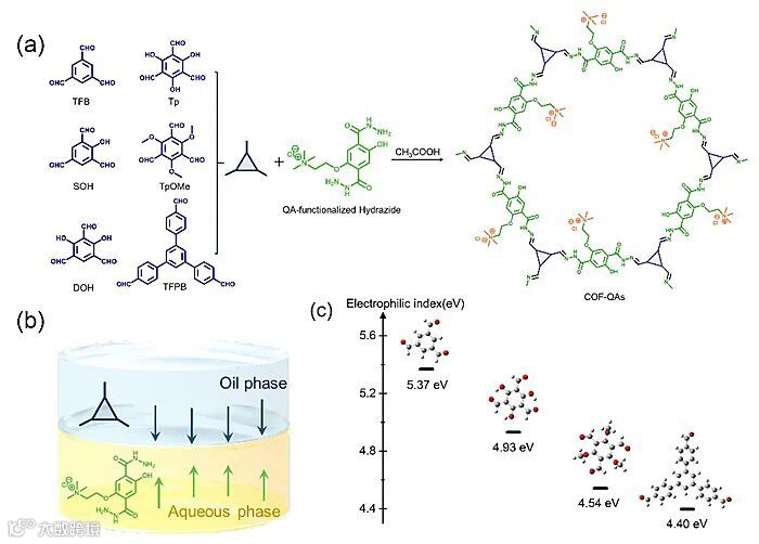 图1. (a) COF-QAs的合成流程图;(b) 有机相-水相反应体系示意图;(c) 醛前驱体亲电指数(ω)的比较。